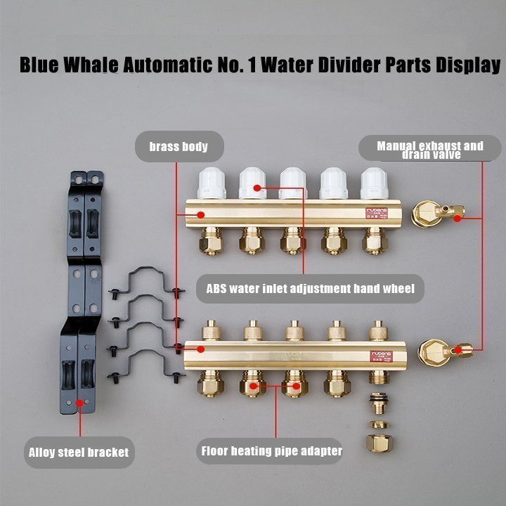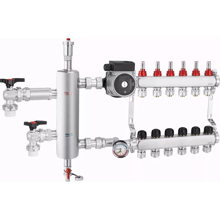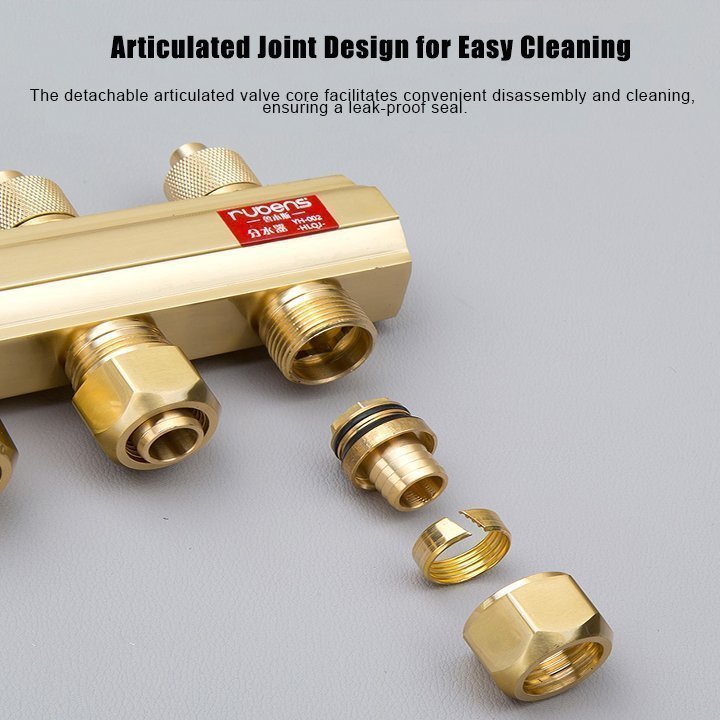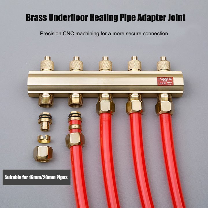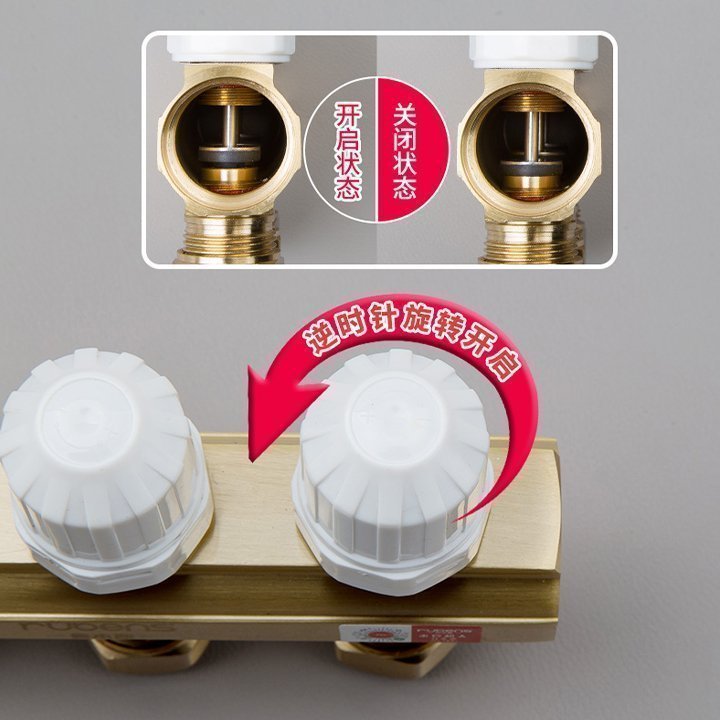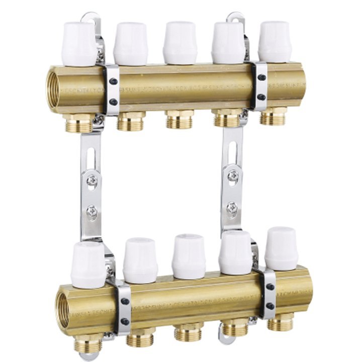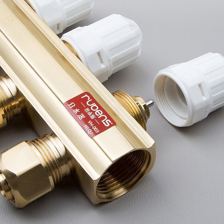 Floor heating manifold is a distribution and collection device in a water heating system, designed to connect various heating pipes for supply and return. Its main functions include pressure boosting, pressure reduction, pressure stabilization, and flow distribution. Typically made of pure copper for corrosion resistance, it can also be constructed with stainless steel; however, it should never be made of cast iron.